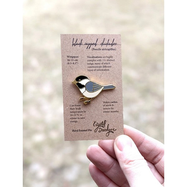 The pin comes on a recycled kraft backing card with scientific chickadee facts.