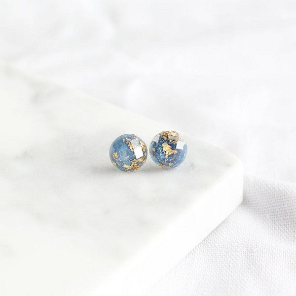 These tiny stud earrings feature a blue, faceted front with delicate flakes of gold foil and glitter inside. They are the perfect stud for everyday wear or for a special occasion.