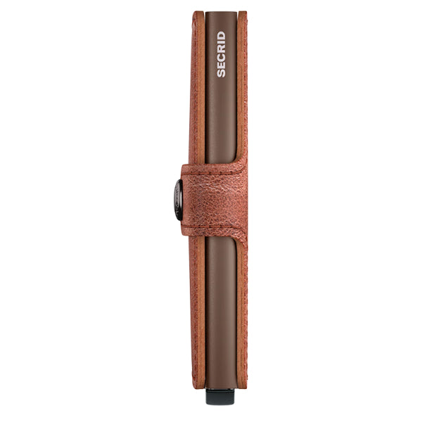The Vintage Miniwallet is compact in size and surprisingly large in storage capacity. The patented mechanism allows you to slide out your cards with one simple motion, ready for immediate use. The aluminum protects from bending, breaking and unwanted wireless communication. The Miniwallet features a button snap closure.