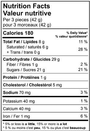 Ingredients: Caramel (Sugars [corn syrup, sugar, fructose, sucrose], milk, hydrogenated coconut oil, butter, mono and diglycerides, salt, soy lecithin, vanillin, water), Chocolate (sugar, cocoa butter, whole milk powder, cocoa liquor, skim milk powder, milk fat, sunflower lecithin, soy lecithin, natural vanilla), Sea Salt.