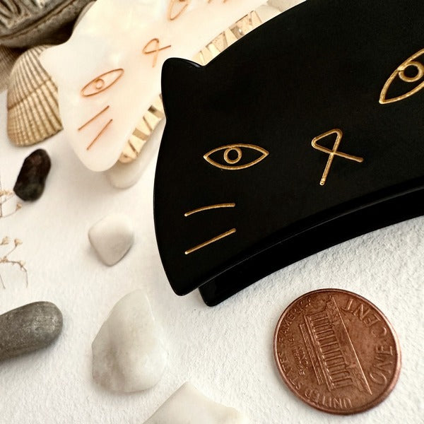 This adorable miser of a kitty is truly a lovely addition to the cat lover's accessory collection. The mother of pearl-esque or classic black colours make this one and easy way to add some fun to your every day hairstyle.
