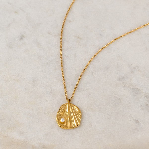 A shell-shaped pendant holds a tiny pearl, making this sun-drenched necklace a unique focal point. Made with PVD and stainless steel, you can wear this waterproof necklace anywhere.