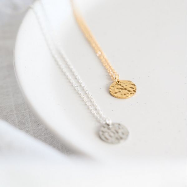 Wood, stone, and water. The Hammered Disk Necklace reminds us of all three, making them a natural fit for Birch Jewellery’s naturalistic collection. The simplicity of the medallion is perfect for layering with other pieces and looks just as beautiful on its own.