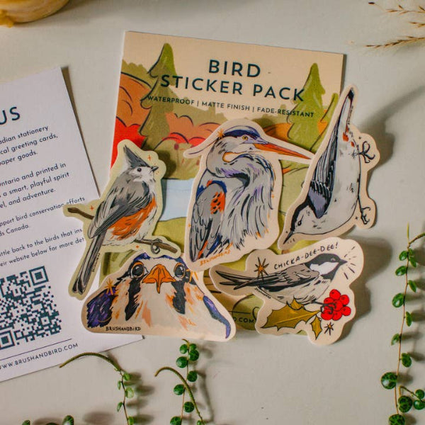 This delightfully whimsical sticker pack includes 5 bird stickers:Chickadee, Nuthatch, Titmouse, Baby Kestrel, and Great Blue Heron