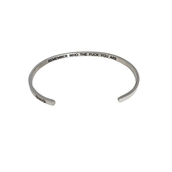 This Stainless Steel bangle reads: "REMEMBER WHO THE FUCK YOU ARE"