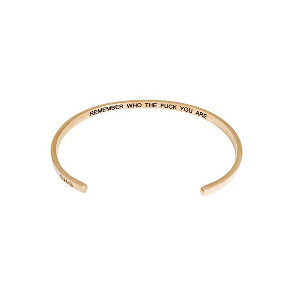 This Yellow Gold bangle reads: "REMEMBER WHO THE FUCK YOU ARE"