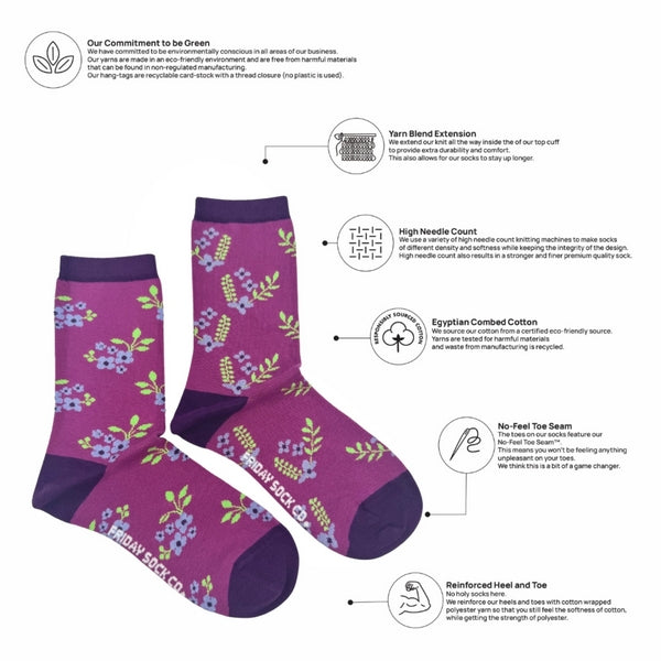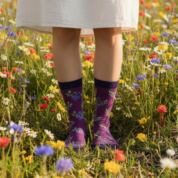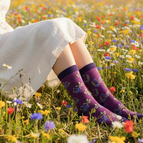 These limited edition socks showcase mismatched clusters of violet flowers set against a calming purple background. Part of Friday Sock Co.'s Floral Collection, each pair of socks comes with a plantable seed paper hang tag. Put into a pot with soil, add water and sunlight, and watch your very own wildflowers start to grow!