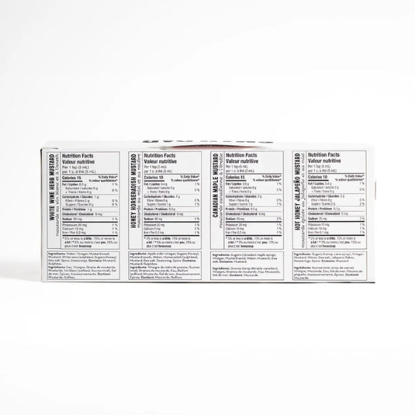 - Canadian Maple: Canadian Maple Syrup, Vinegar, -Mustard Seed, Water, Sea Salt.