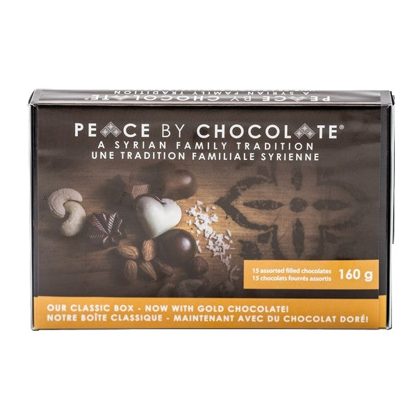 A series of 15 delicious assorted chocolates. Each is made in Peace by Chocolate's traditional Syrian style. Smooth dark chocolate (some with a pistachio treat!), creamy white chocolate, unique gold chocolate, and their classic milk chocolate in a variety of shapes!