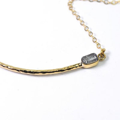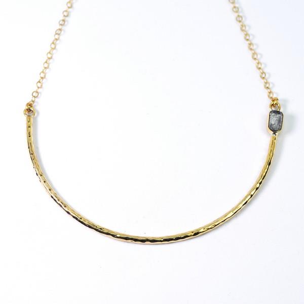 Ottawa designer Lissa Bowie, who lives in Canada and Mexico, defines her work by instinct and intuition. Each piece tells its own story, and is distinctive in style. The Aviva curve bar necklace features a single stone of quartz. Each stone's cut varies, producing a unique feature for individual necklaces.