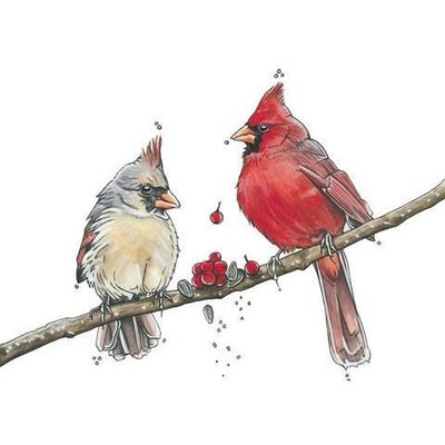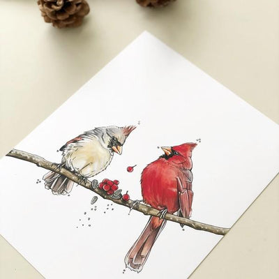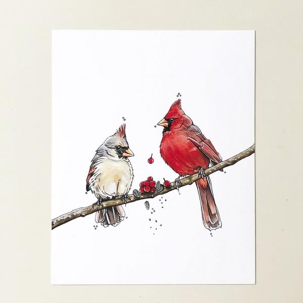The perfect art print to send this holiday season or even to give as an anniversary gift! Did you know during courtship male cardinals feed seeds to female cardinals? This method is known as, "beak to beak" and resembles kissing!