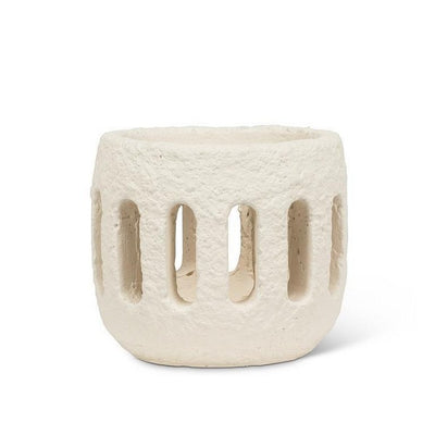 This ivory-coloured "hurricane" is perfect for holding a votive or tea light. The cut out windows cast a warm, flickering glow, which is enhanced by the raw, matte texture. The candleholder adds a serene and natural touch to any space and combines beauty with practicality.