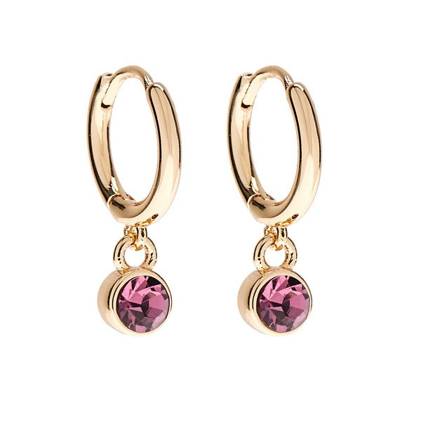 The birthstone collections lets you individualize your everyday style with a set of earrings you can mix and match for any occasion. The February Birthstone Earrings showcase delicate huggie hoops with a dangling amethyst-toned gemstone that represents wisdom.