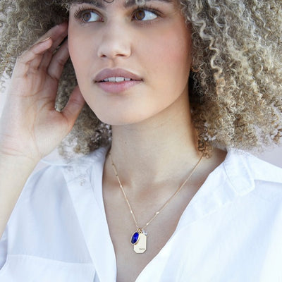 The birthstone collection lets you individualize your everyday style with effortless and easy-to-layer cluster charm necklace. The September Birthstone Necklace showcases a radiant oval cut sapphire-toned gemstone that represents truth.