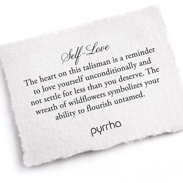 "Self Love:The heart on this talisman is a reminder to love yourself unconditionally and not settle for less than you deserve. The wreath of wildflowers symbolizes your ability to flourish untamed."