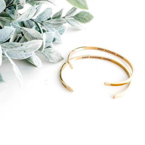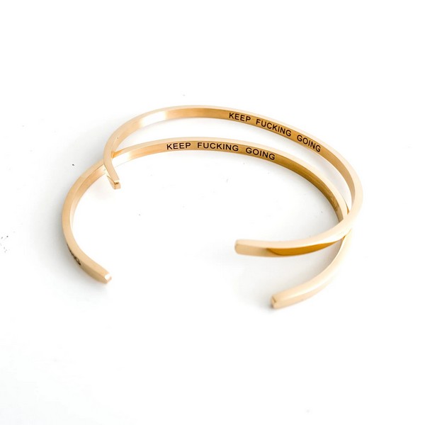 These simple and bold bangles from Glass House Goods are the perfect piece of jewellery to make a secretive statement. Plain and unassuming on the outside, with badass truths on the inside! Keep a reminder to yourself close by, without revealing how you feel to anyone else! These bangles are available in one size but can be tightened by carefully squeezing closed (doing this repeatedly may jeopardize the integrity of the metal).